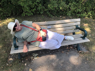 I think I made a mistake having a big guzzle of ice-cold beer in the blazing sun because after lunch I could barely put one foot in front of the other. Literally pulled up a park bench and had a 35-minute power nap - as in really asleep. @Mac's lap was of course my pillow. The only problem was that he had sat so still on the slats of the bench, the weight of my head was squeezing his bottom through the cracks between the slats. With all those blood thinners, we will be checking for bruises tomorrow!